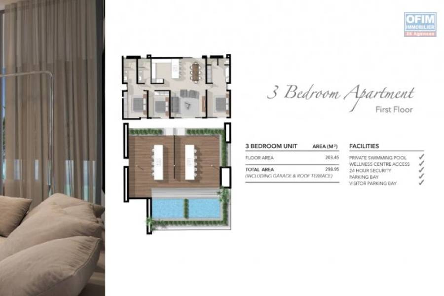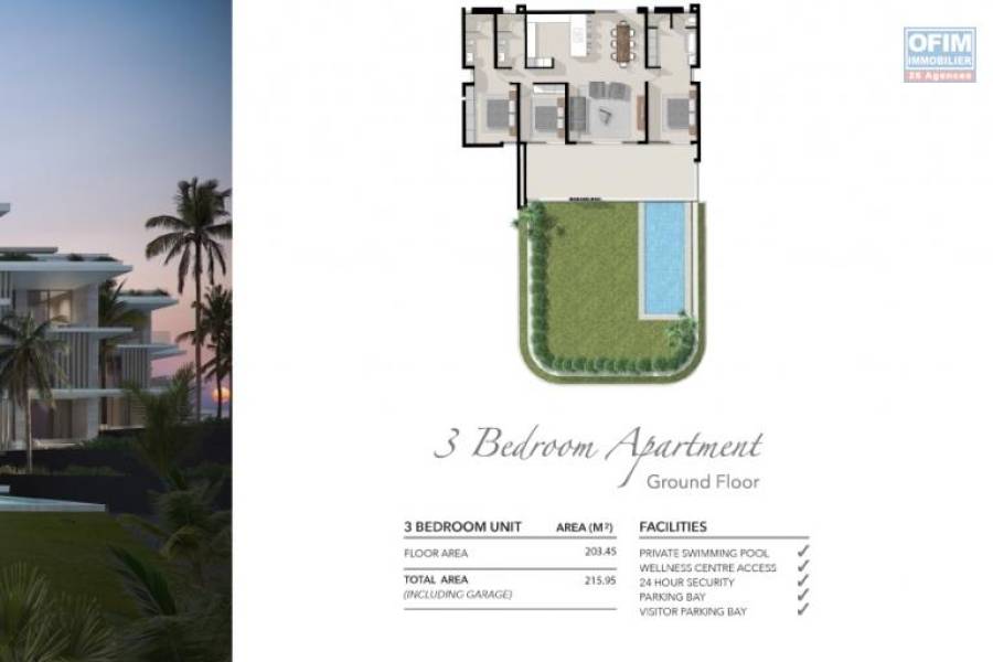 OFIM vous propose à la vente un appartement de très haut standing avec une vue panoramique du lagon et des îles des alentours à Pointe aux Canonniers. Ce très beau logement de luxe de type F4 est situé dans un quartier résidentiel le plus prisé de la côte nord. Il est non loin du lagon et des commodités. Ce magnifique bien comprend trois chambres à coucher climatisées, un lumineux séjour, une cuisine moderne aménagée et équipée. Il est aussi disponible aux résidents un espace de divertissement (patio), un accès au centre de bien-être, un service de sécurité 24h/24h, un parking couvert et un espace parking pour visiteur. Ce bien est accessible aux étrangers. Enregistrement Vendeur 5 % Notaire : 1,15% Prix: Rs 26,350,000 Ref: FV7000 Norbert Couret [coordonnées réservées] [coordonnées réservées] 27A55646, Numéro de mandat: FV7000 Tél. commercial: [coordonnées réservées]