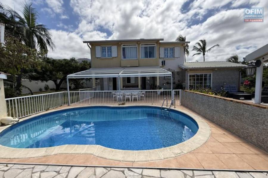 L'agence OFIM d'Etang Salé Les Hauts vous présente à la vente cette magnifique propriété F5/6 avec garages et piscine, idéalement située en hyper centre d'Etang Salé Les Hauts, en impasse, un véritable havre de paix, parfait pour une grande famille, le tout implanté sur un terrain plat de 1515 m² sans vis à vis, il est possible de construire d'autres habitations sur le terrain. Caractéristiques du bien : - Maison de Type F5/6 climatisée en R+1 de 135 m² habitables - Garages de 30 m² (vélos et atelier doubles porte basculante) et 25 m² voitures avec portes basculantes - Varangues : 15,30 m² au Rez-de-Chaussée et 7,60 m² fermée à l'étage - Terrasses de 48 m² devant le séjour et 42 m² devant la maison - Buanderie/atelier créatif de 10 m² - Atelier bricolage de 15,30 m² (porte deux battants) - Terrain de 1515 m² en zone UC du PLU soit (9 m au faitage), plat, arboré et fleuri - Piscine de 43 m3 et de (7,70 m x 4,6 m et 2,10 m profondeur grand bassin) et sa plage de 32,30 m² - Cuisine d'été couverte et terrasse couverte de 10 m² Composition de la maison : Au Rez-de-Chaussée : - 1 chambre/bureau de 8,7 m² - 1 séjour spacieux de 25,36 m² - 1 grand salon/espace repos de 24 m² - 1 cuisine de 10,50 m², avec accès salon et séjour - 1 WC de 2 m² - 1 varangue de 15,30 m² À l'Étage : - 3 chambres de 14 m², 10,50 m² et 7 m². - 1 salle d'eau de 8,80 m² - 1 WC de 2 m² - 1 dressing de 5,8 m² - 1 varangue fermée de 7,60 m² (rangement, repassage) - 1 dégagement de 8,70 m² - 1 petit grenier accessible et isolé de rangement/stockage, accès direct via un escalier en bois dans la grande chambre - 1 petite mezzanine (espace enfants) Détails supplémentaires : - Places de stationnement intérieur - Portail électrique - Chauffe-eau solaire - menuiserie aluminium en double vitrage dans toute la maison. - Taxe foncière : 2423 € Commission d'agence : À la charge du vendeur. Pour plus d'informations ou pour planifier une visite, n'hésitez pas à contacter François HART (agent commercial) au [coordonnées réservées] ou par email à [coordonnées réservées] Honoraires à la charge du vendeur 8A71700, Numéro de mandat: 2324ESH Tél. commercial: [coordonnées réservées]