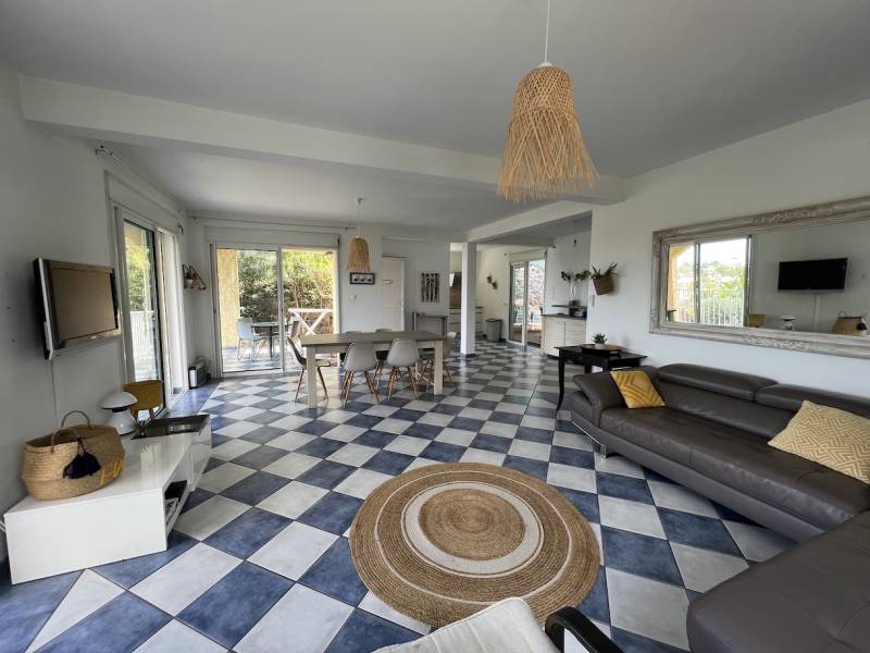 Belle villa T5 d'une surface utile de 190 m² sur une parcelle de 700 m² qui offre le double avantage d'avoir une vue mer et d'être accessible au centre-ville à pieds.