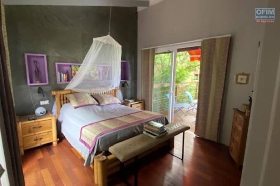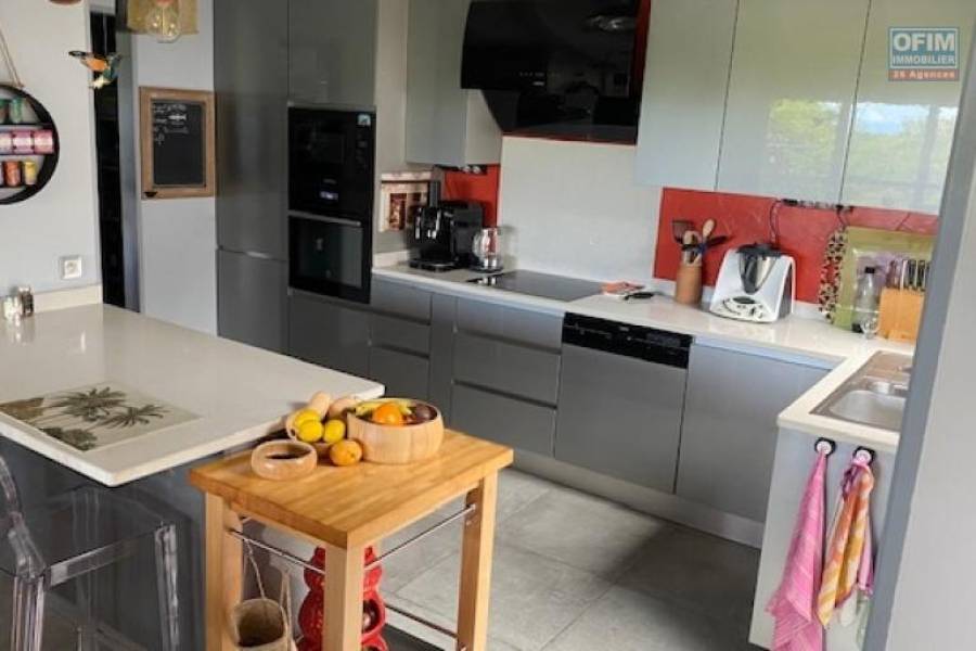 Ofim vous propose à la vente cette Villa d'architecte T4 plus studio indépendant en plein coeur de La Montagne à proximité de tous les commerces, écoles... Ce bien de 135m2, au calme niché dans un écrin de verdure (terrain 1052m2 arboré, arbres fruitiers) vous séduira forcement . Maison traversante tres bien aérée . RDC: 1 grand salon salle à manger (environ 33m2) donnant sur un belle varangue (49m2) avec vue mer, une cuisine ouverte avec un cellier, 1 buanderie, 1 patio avec rangements, 1 chambre parentale avec une salle de douche, un dressing et une douche extérieur, piscine et jardin . ETAGE: 2 belles chambres (environ 13m2)., une salle de douche . Dans le jardin, un bungalow comprenant un studio avec lavabo, douche et wc. . Les plus : nombreux rangements, abris voiture/ moto..., places de stationnement, panneaux photovoltaïques, piscine chauffée (capteurs solaire), espace détente au bord de la piscine, magnifique jardin arboré d'arbres fruitiers et de plantes endémiques . Relié au tout a l'égout. N'hésitez pas à me contacter au [coordonnées réservées] (Karine) pour visiter et découvrir cet havre de paix dans la verdure.. Taxe foncière: 3241€ PRIX de vente: 560 000€ Honoraires à la charge du vendeur 22A71468, Numéro de mandat: 491 Tél. commercial: [coordonnées réservées]