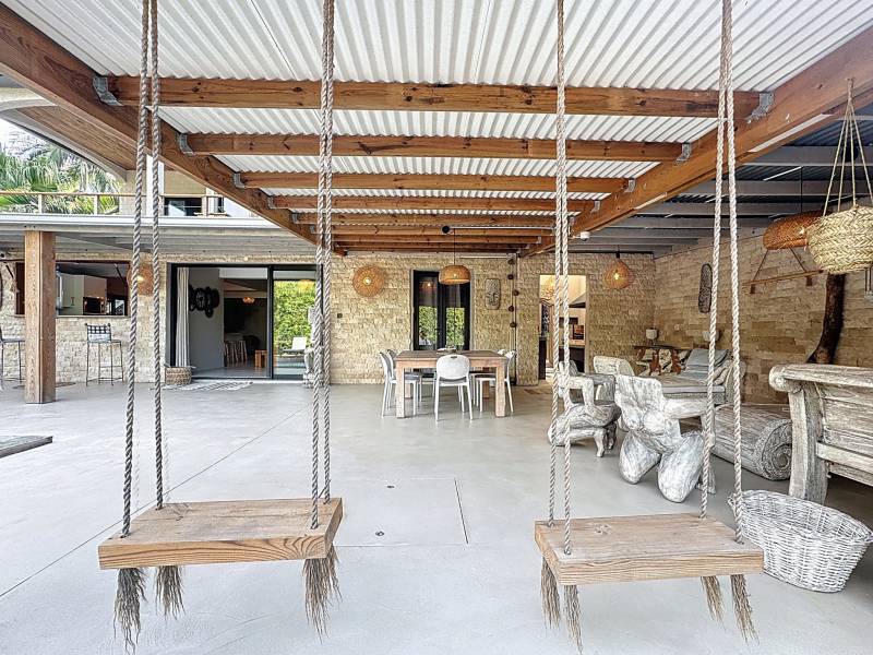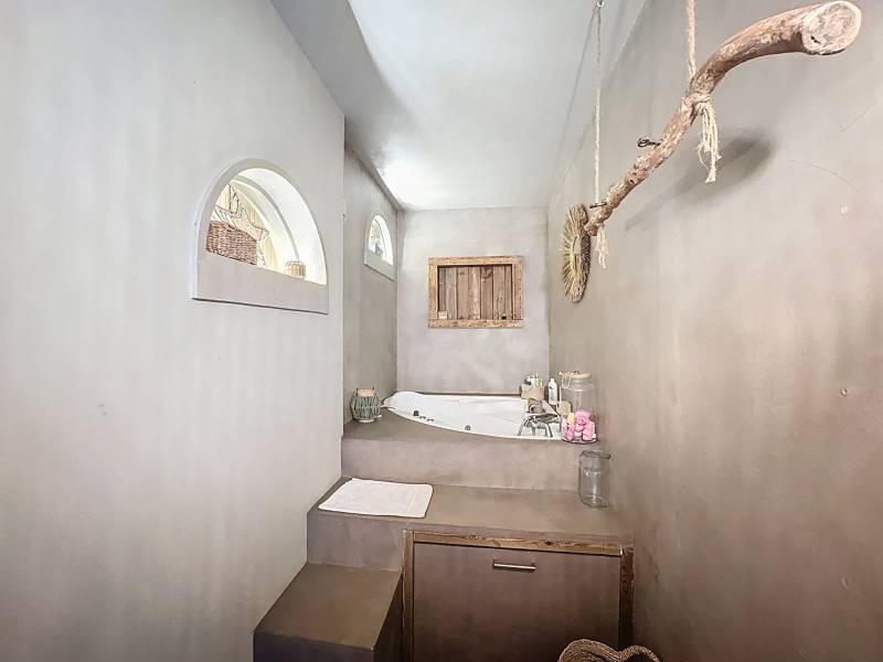 Composée d'une entrée, d'un bureau, de trois chambres dont une suite parentale de 24 m2 avec baignoire et douche. Au rez-de-jardin un espace entiérement ouvert de 50 m2 sur salon/salle à manger et cuisine, une buanderie et une salle de bains avec toilettes et hamman. L'extérieur dispose d'une grande terrasse, piscine en pierre naturel, terrain de pétanque, bassin, salon d'extérieur, cuisine extérieur et espace balnéothérapie.