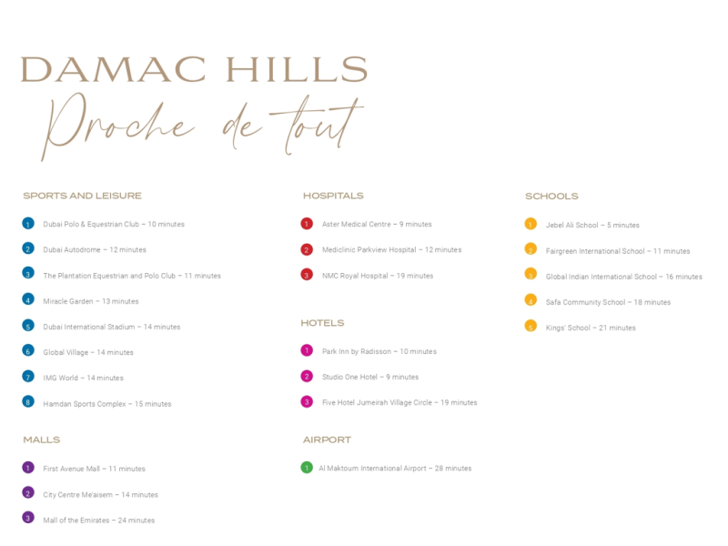 Dans la quartier de DAMAC HILL, tout à été pensé pour vous offrir une qualité de vie exceptionnelle . Vous pourrez profiter d'un très grand éventail d'activités sportives car le complexe résidentiel est équipé d'un terrain de golf, basket-ball de football, de tennis, de criket, de voley-ball et d'une écurie. Vous aurez le loisir d'utiliser le parc pour les barbecues, les aires de jeux pour enfants, le mini golf pour enfants, la patinoire, la piste de jogging, de 2 grands parcs et d'un parc déidié au pique-nique.