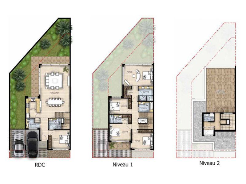 Concernant le détail de la distribution des pièces, vous y trouverez au RDC un garage couvert (deux places de voitures), un séjour, une cuisine, un chambre avec placards, salle de bain et WC, un WC individuel, une buanderie, un placard de rangement, un jardin. Au niveau 1 : 4 chambres dont une chambre avec WC , 1 salle de bain , balcon et placards, 2 chambres simple (dont une avec balcon), une salle de bain individuelle, une chambre parentale avec salle d'eau et WC. Au niveau 2 : chambre de la femme de ménage avec salle d'eau, une terrasse.