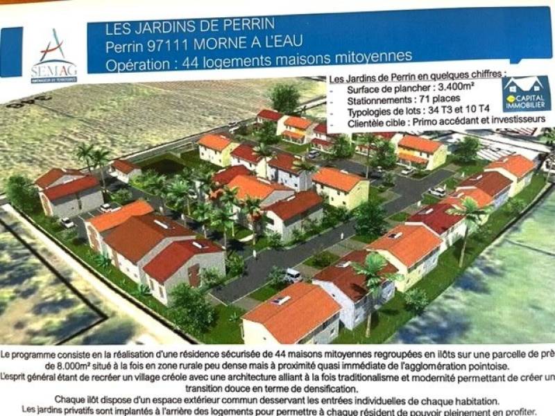 CE NOUVEAU PROGRAMME MODERNE SITUE LIMITE ABYMES ET MORNE A L EAU PROCHE DU NOUVEL HOPITAL EN CONSTRUCTION DES ABYMES CONSISTE EN LA REALISATION D'UNE RESIDENCE SECURISEE DE 44 VILLAS MITOYENNES REGROUPEES EN ILOTS SUR UNE PARCELLE DE PRES DE 8000M2 SITUEE A LA FOIS EN ZONE RURALE PEU DENSE MAIS A POXIMITE QUASI IMMEDIATE DE L'AGGLOMERATION POINTOISE. CHAQUE ILOT DISPOSE D'UN ESPACE EXTERIEUR COMMUN DESSERVANT LES ENTREES INDIVIDUELLES DE CHAQUE HABITATION. LES JARDINS PRIVATIFS SONT IMPLANTES A L ARRIERE DES LOGEMENTS POUR PERMETTRE A CHAQUE RESIDENT DE POUVOIR PLEINEMENT EN PROFITER. SOYEZ LES PREMIERS A RESERVER VOTRE NOUVEAU LOGEMENT EN APPELANT CAPITAL IMMOBILIER ! LIVRAISON 2025