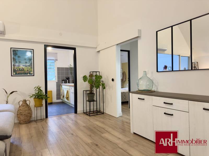 L'appartement comprend une entrée / dégagement, un séjour de 24 m² environ avec une belle hauteur sous plafond, une cuisine aménagée, une chambre climatisée avec placards de rangement, une salle de bains élégante et un WC indépendant, garantissant intimité et fonctionnalité. Le stationnement intérieur sécurisé complète ce bien, offrant une solution pratique pour votre véhicule.