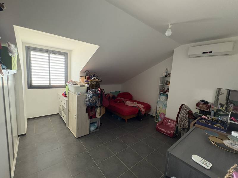 À l’étage : Un dégagement, une salle de bains avec WC, une seconde chambre climatisée avec placard