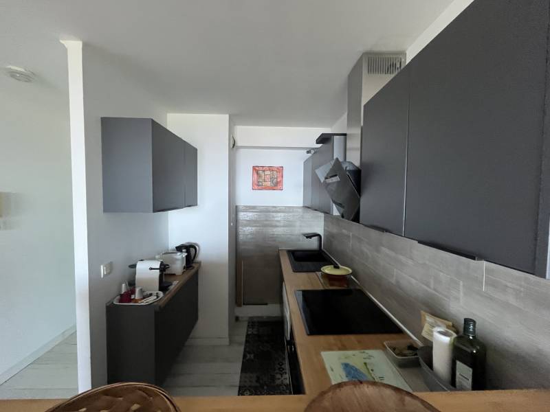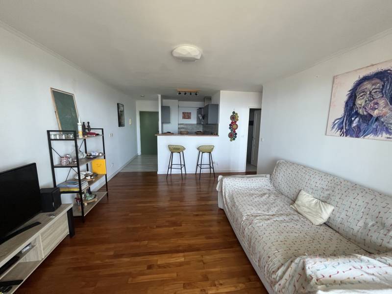 Salon lumineux avec coin cuisine, offrant un espace de vie moderne et convivial.