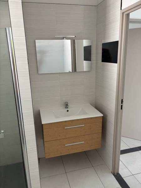 L'appartement est composé d'une chambre climatisée avec brasseur d'air (13.89 m2), d'un séjour (16.32 m2), une cuisine (5.97 m2), une salle d'eau avec toilette (4.71m2) et une varangue de 10.35 m2.