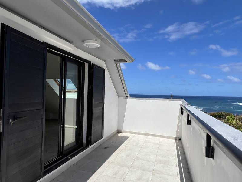 L’espace nuit se compose de deux chambres climatisées avec rangements intégrés, ainsi qu’une salle d’eau avec WC. À l’étage, une suite parentale prend ses quartiers : salle d’eau privative, WC, et surtout un balcon aux vues spectaculaires sur l’océan et les reliefs environnants. Ici, aucun vis-à-vis, aucune mitoyenneté : vous vivez comme dans une maison sur le toit.