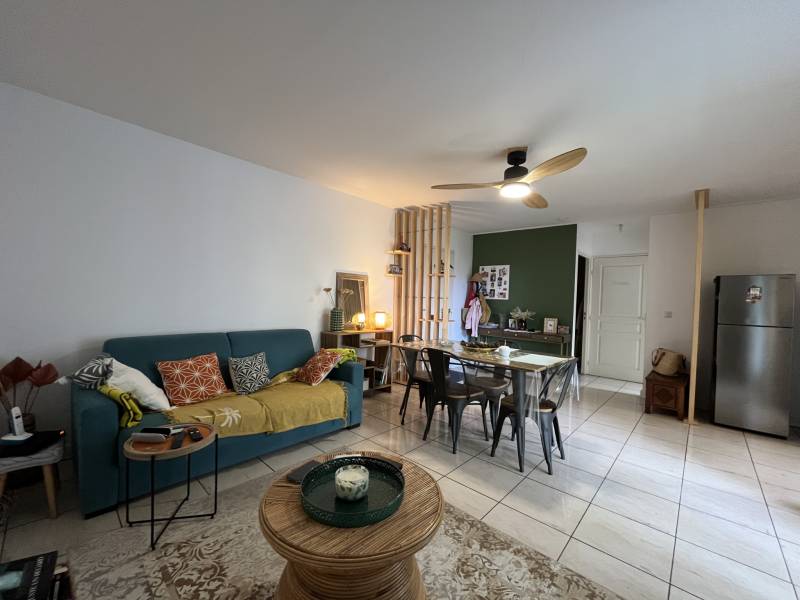Il comprend un grand séjour d'environ 23,65m2, une jolie cuisine ouverte, rénovée et équipée d'environ 7m2, une belle chambre climatisée avec placard (11m2), un WC séparés, une salle de bain et une grande varangue de presque 14m2.