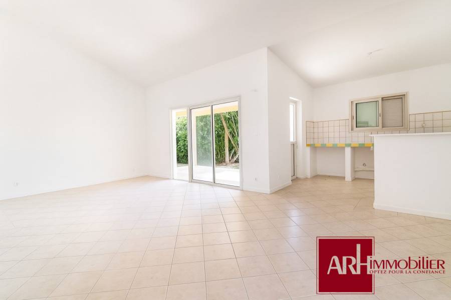 un grand séjour lumineux avec une cuisine ouverte , une salle d'eau et un wc avec 3 chambres dont une suite parentale et sa grande terrasse .