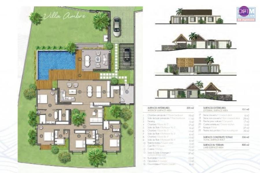 ELLIGIBLE A L’ACHAT AUX ETRANGERS! SITUATION Idéalement situé dans le Nord de l’Ile, à proximité de la station balnéaire de Grand Baie. Le projet comprendra : • 14 Villas individuelles de 4 chambres climatisées et leur salle de bains en suite, dressing etc.. • Sur des lots de 800m², clos de murs.les villas Ambre sont d’une surface de 336 m2 . • Chaque villa ayant un jardin privé avec kiosque et piscine a fond ardoise • Architecture et décoration intérieure de style contemporain combinant matériaux traditionnels et matériaux nobles 16A49462, Numéro de mandat: 1288GBb Tél. commercial: 57 48 70 03