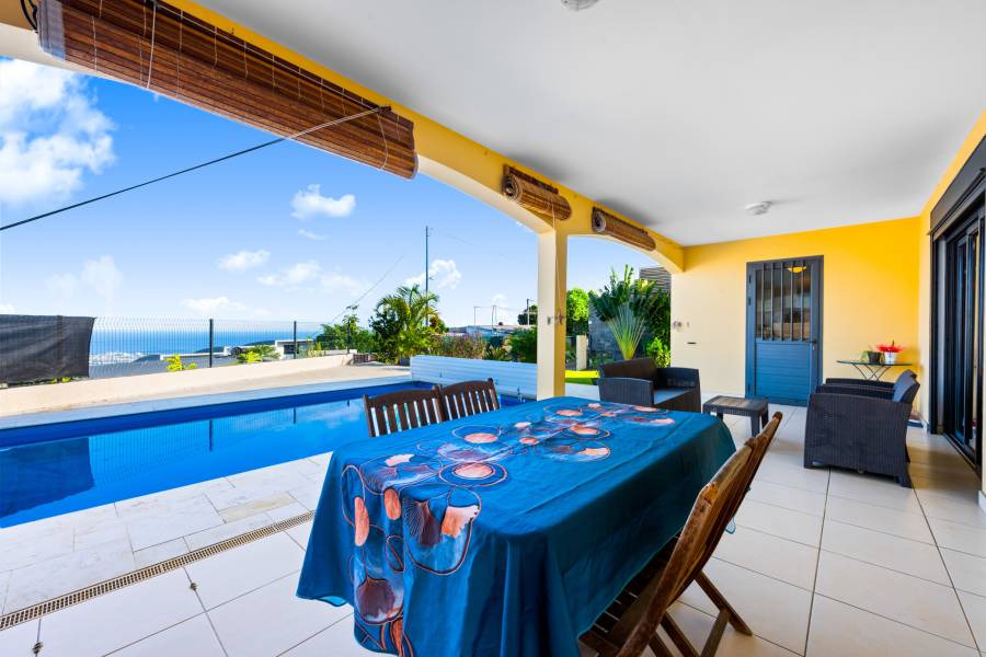 A l'extérieur, une grande varangue de 23 m2 permettant d'admirer une vue mer et de profiter de la piscine chauffée.