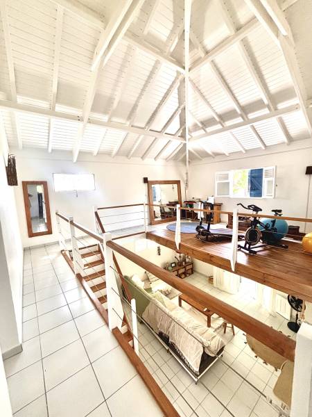 Mezzanine aménagée, actuellement utilisée comme salle de sport, offrant une véritable surface supplémentaire polyvalente (bureau, espace jeux, coin lecture…)