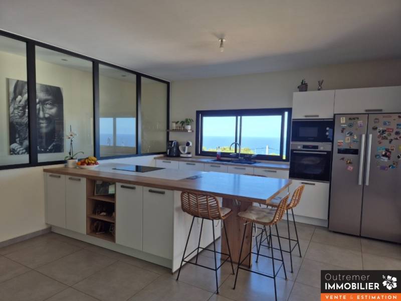L’espace principal s’articule autour d’une vaste pièce de vie ouverte, et lumineuse avec cuisine équipée donnant sur une grande varangue avec vue mer imprenable.