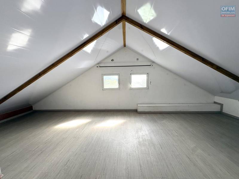 A l'étage se situent les combles qui ont été aménagés en deux grandes chambres de 40 m2 au sol chacune ainsi qu'un espace sanitaire avec douche et WC. Au vu de la superficie des chambres de l'étage, vous aurez la possibilité de créer 2 chambres supplémentaires. Un garage de 25 m2 environ vous permettra d'y stationner un véhicule et d'y faire du rangement.