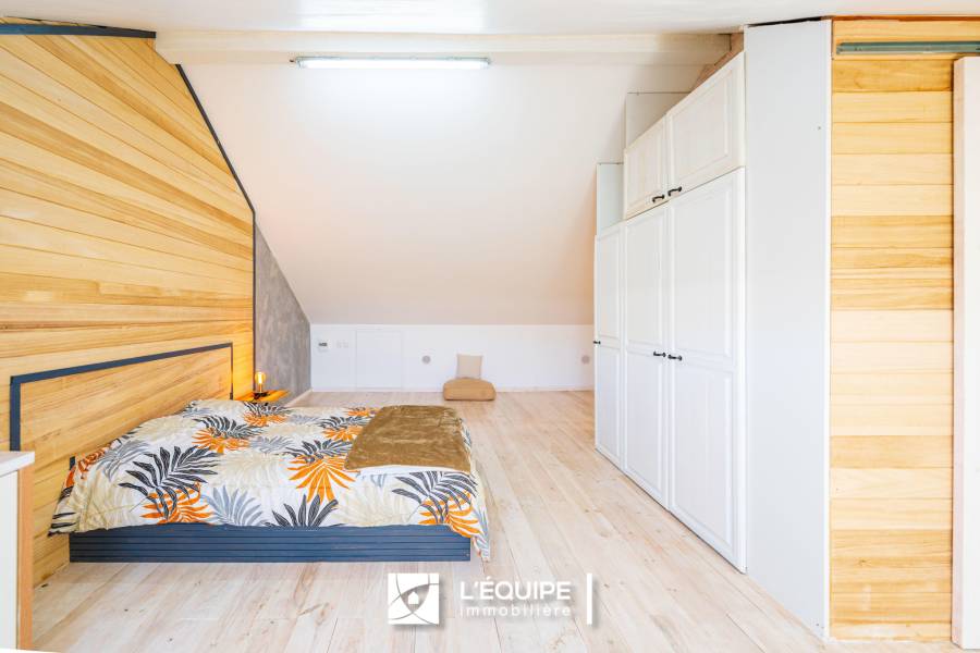 Un escalier permets d'accéder au niveau des combles joliement aménagées en chambre spacieuse et agréable d'environ 22 m2.