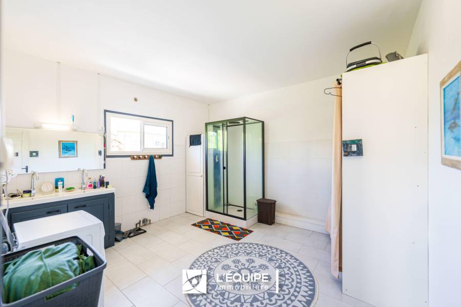Elle se compose au rez-de-chaussée d'un séjour ouvert sur une cuisine semi-équipée de plus de 49 m2, de deux chambres toutes deux équipées d'une douche ou d'une baignoire, d'un WC et deux terrasses.