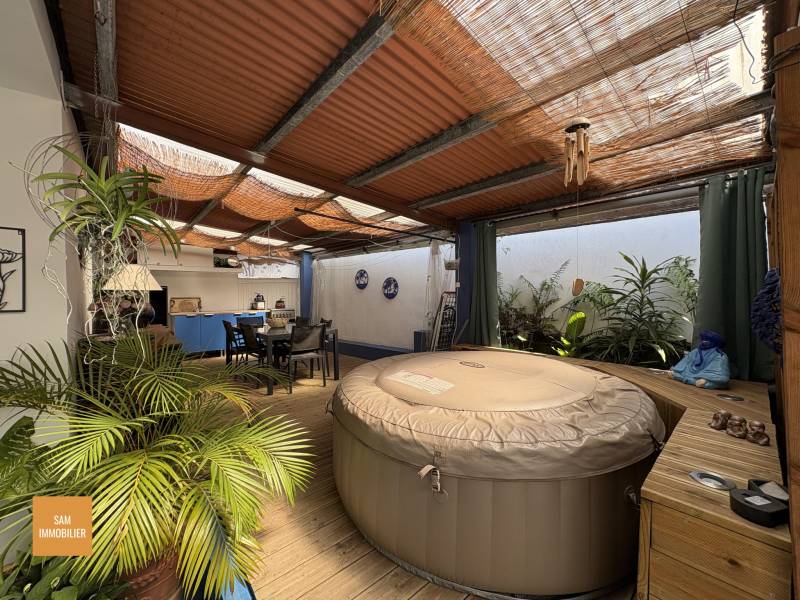 Implantée sur une parcelle de 531 m2, cette propriété mesure 120m2 environ (maison + dépendance).