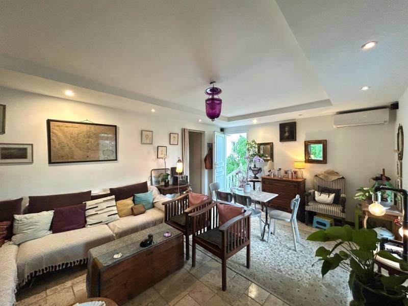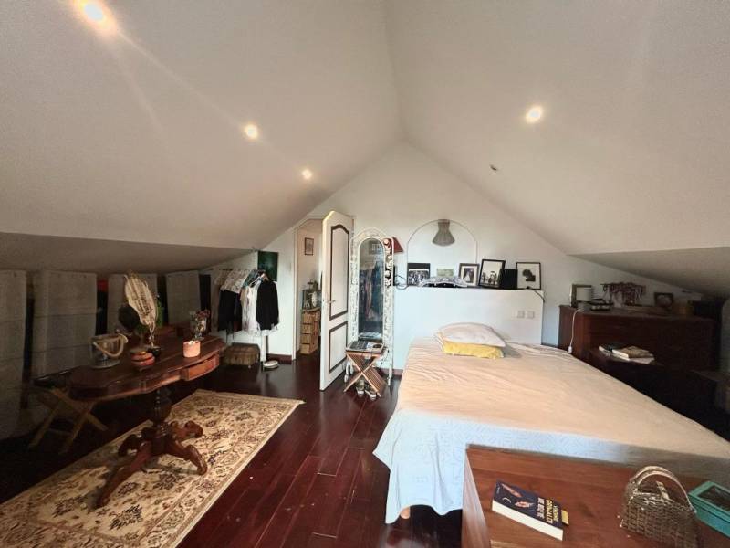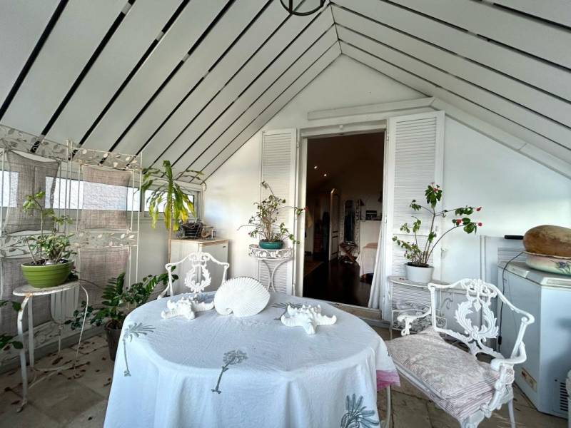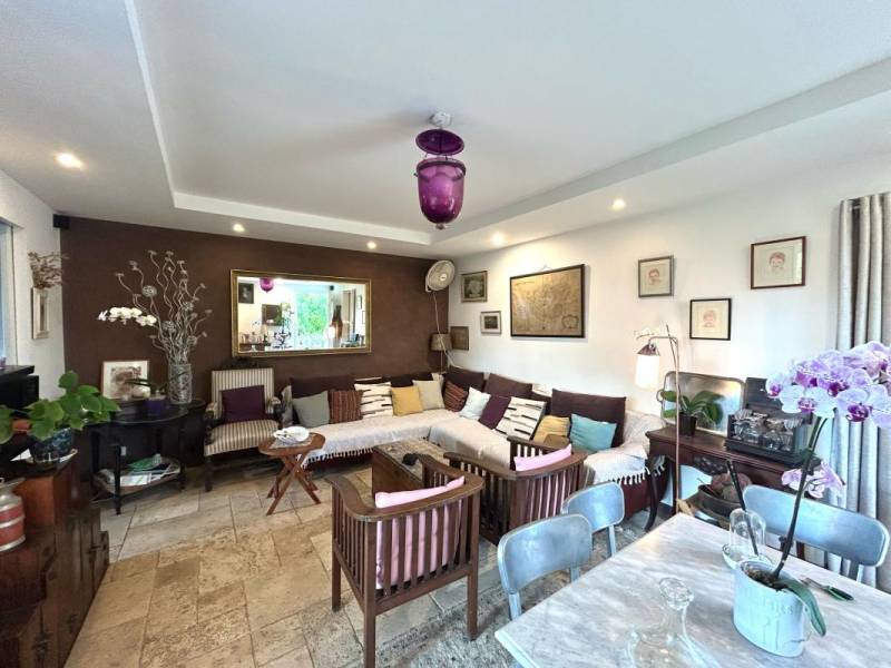 Vous profiterez de 2 chambres, 1 bureau, 2 salles de bains avec wc, d'une grande pièce à vivre, une cuisine équipée et deux grandes terrasses aménagées avec vue sur les jardins.