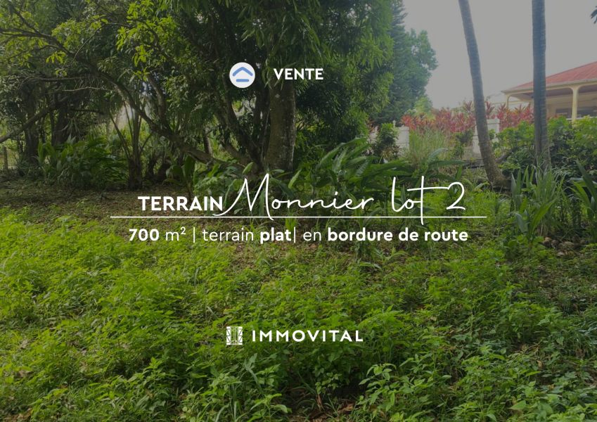 IMMOVITAL vous propose à la vente ce superbe terrain plat de 700 m2, situé dans le quartier recherché de Monnier, sur la commune du Lamentin, en Guadeloupe.