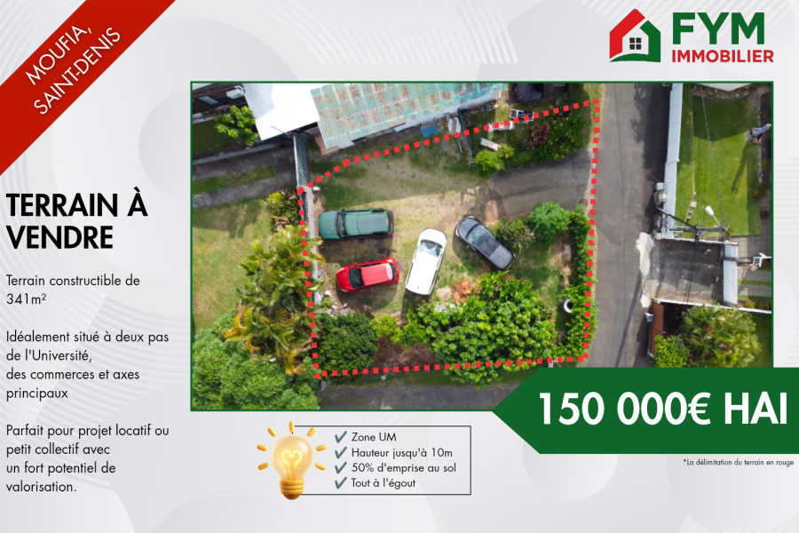 FYM IMMOBILIER vous propose à la vente un terrain constructible d’une superficie de 341 m2, idéalement situé dans le secteur recherché du Moufia à Saint-Denis, à proximité immédiate de l’université, des commerces, des transports et des principaux axes routiers.