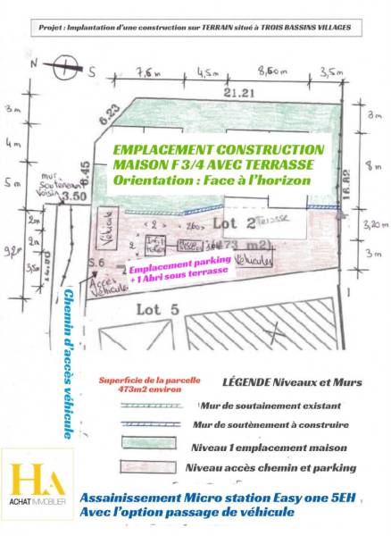 Patrice Moulant - HA IMMOBILIER vous propose un terrain constructible de 473 m² situé dans un secteur calme, proche de l'école du village, situé en zone UB. UN TERRAIN AVEC POTENTIEL RARE : ? Possibilité d'aménagement en 2 niveaux ? Projet idéal avec accès véhicules en partie basse ? Construction sur partie haute avec vue dégagée ? Environnement résidentiel agréable PROJET DE CONSTRUCTION (gain de temps) : ? Implantation maison type F3 / F4 ? Terrasse orientée vers l'horizon ? Stationnement intégré sous la maison ? Solution d'assainissement prévue Micro Station Plan de masse disponible (voir photo) EAU - TELECOM à raccorder ÉLECTRICITÉ Gaine prête a être raccordée « en attente sur le terrain » Travaux à prévoir : ? Terrassement / création de plateformes ? VRD et murs moellons et de soutènement suivant projet Idéal pour acquéreur souhaitant un projet personnalisé avec fort potentiel de valorisation. A environ 15 minutes de la 4 Voies et 20 minutes du littoral Pour tout renseignement Patrice MOULANT (IE) - [coordonnées réservées] RSAC St Pierre 481 585 107 Bien non soumis au DPE Les informations sur les risques naturels auxquels ce bien peut être exposé sont disponibles sur le site: www.georisques.gouv.fr Patrice MOULANT (EI) Agent Commercial - Numéro RSAC : 481585107 - SAINT PIERRE.