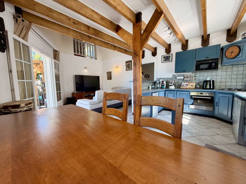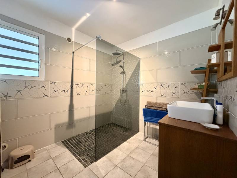 Elle s'accompagne d'un garage,d'une buanderie et d'une varangue avec vue sur la mer, une pergola ,une piscine au sel chaufée pour profiter de moment de calme et de loisir.. De plus vous pourrez profiter d'un jardin arboré de 300 m2