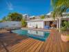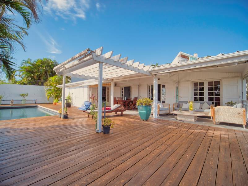 Piscine au chlore avec plage en pin et espace pergola aménagé.