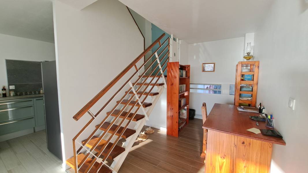 Niveau principal : un salon-séjour spacieux lumineux, idéal pour créer un espace de vie convivial, un dégagement aménagé en coin bureau, une cuisine ouverte sur le séjour, un balcon avec vue mer.