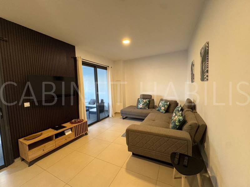 Elle se compose d’un séjour lumineux avec cuisine ouverte, aménagée et semi-équipée, de deux chambres climatisées, et d’une salle d’eau avec un WC.