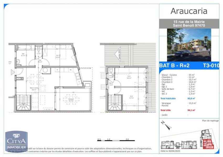 L'agence Citya Belvédère vous présente en exclusivité cet appartement T4 duplex NEUF de 80,80m² situé à SAINT-BENOIT (97470), et plus précisément dans le quartier du Butor. L'appartement est proche de toutes commodités (commerces, arrêt de bus, écoles...). Ce beau T4 duplex, au 2ème et dernier étage, se compose au rez-de-chausée d'un séjour de 35m², d'une chambre avec placard, d'une cuisine aménagée ouverte sur le séjour, d'une salle de bain, d'un WC séparé et d'une varangue de 13,30m². À l'étage, se situent deux chambres avec placard et un WC séparé. L'appartement est à louer avec une place de parking couverte. Disponible à partir de Novembre 2025 ! Envie d'en savoir plus sur cet appartement en location ? Prenez rapidement contact avec votre agence Citya Belvédère au [coordonnées réservées]. Loyer de 975,00 euros par mois charges comprises dont 80,10 euros par mois de provision pour charges (soumis à la régularisation annuelle). Soit avec Assurance Habitation et Assistance* ( 31.00 euros ) : 1 006,00 euros. Les honoraires charge locataire sont de 888,80 euros ( soit 11,00 euros/m² ) dont 242,40 euros pour état des lieux ( soit 3,00 euros/m² ). Vous pouvez consulter les barèmes d'honoraires à l'adresse suivante : https://www.citya.com/agences-immobilieres/sainte-suzanne-97441/547#bareme-location Les informations sur les risques auxquels ce bien est exposé sont disponibles sur le site Géorisques : https://www.georisques.gouv.fr. *Service facultatif. Contribution annuelle "attentats" non comprise. Voir conditions en agence.