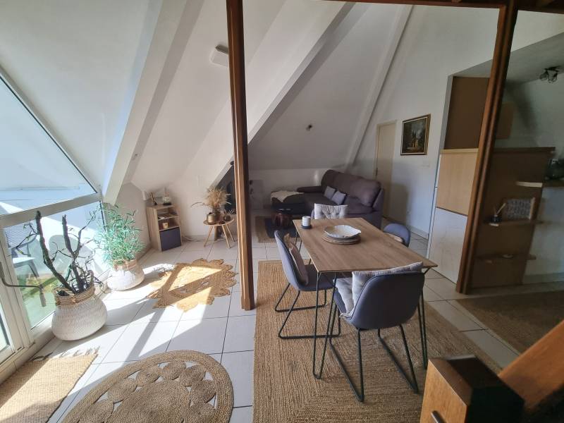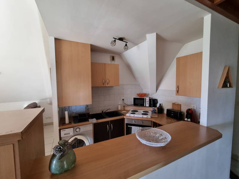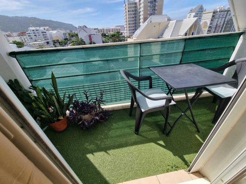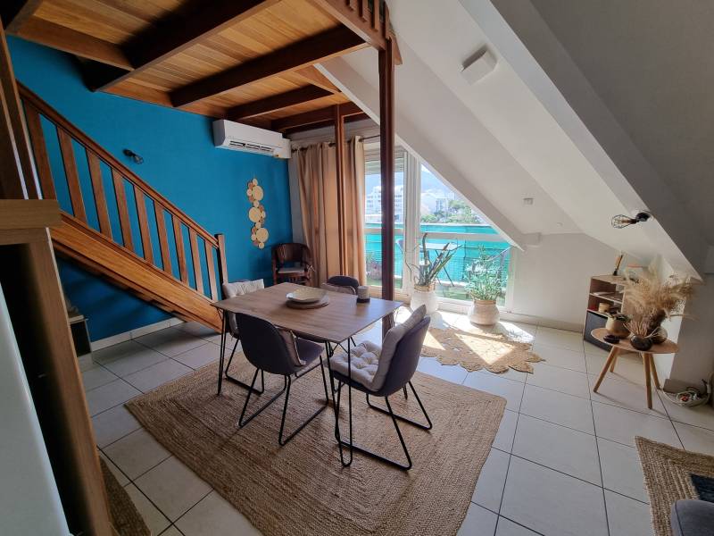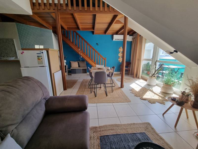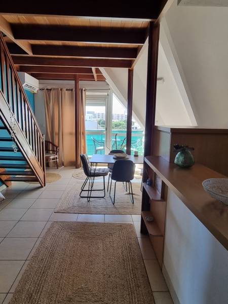 Cet appartement orienté ouest, très lumineux, est composé d'une entrée, d'un grand séjour climatisé donnant sur un petit balcon, d'une grande cuisine équipée et très fonctionnelle, d'une salle de bain, d'un WC séparé et d'une chambre en mezzanine.