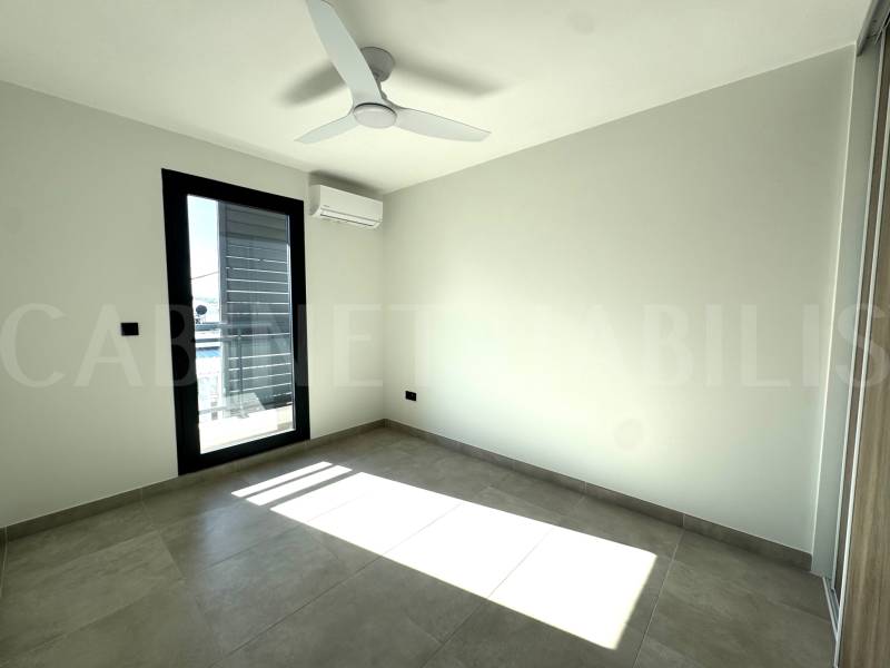 Elle se compose d’un séjour lumineux avec cuisine ouverte, aménagée et semi-équipée, de deux chambres équipées d'un climatiseur, d'un brasseur d'air et d'un placard, d’une salle d’eau avec double vasque ainsi qu'un WC séparé.