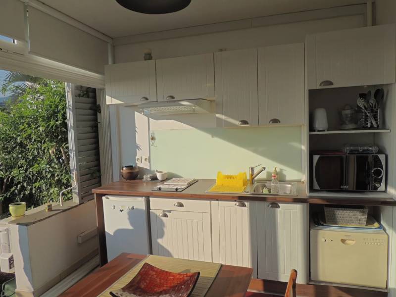 Une entrée, une pièce principale climatisée avec placards, cuisine aménagée et équipée donnant sur un jardin privatif de 12m² et une salle d'eau avec wc.