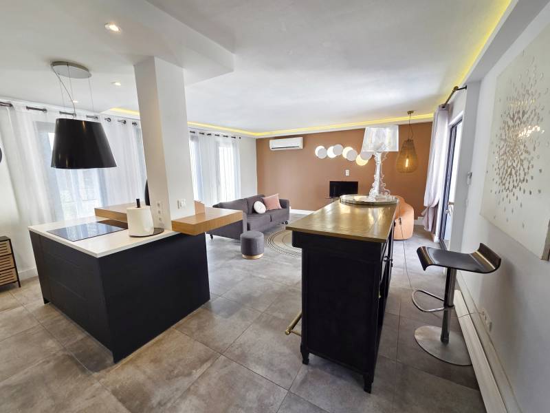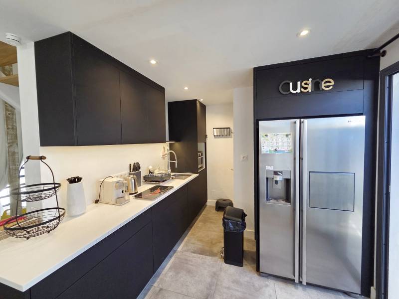 - au RDC par une porte sécurisée, rangement sous l'escalier et accès au 1er niveau sur un vaste séjour-cuisine proposant plus de 40m2 très bien aménagé, traversant, avec nombreuses ouvertures sur balcon d'un côté et terrasse de près de 25m2 de l'autre. La cuisine, très bien aménagée et meublée, avec plan et ilot central, frigo américain et électroménager, permet une utilisation optimale. 2 céliers dont 1 avec lave-linge et sèche linge et l'autre permettant de stocker et ranger, et un cabinet de toilettes.