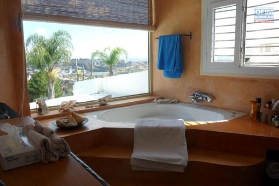 OFIM propose en location une villa F7 avec piscine avec vue à Ambatobe. Le living avec de grandes baies vitrées donne sur la piscine débordante. Toujours au RDC 2 chambres avec chacune une salle de bain. Une pièce pouvant servir de home cinema. une cuisine équipée avec placards, une buanderie. A l'étage, la chambre principale avec sa salle de bain privée, un dressing et WC et un bureau. Un système de sécurité avec alarme, détecteur de mouvement laser ainsi que 2 miradors est installé dans la propriété. A l'extérieur, une grande piscine débordante avec une superbe vue sur Tana, un abri pour 3 voitures, un parking et une dépendance personnel. LOYER: 2 500euros le loyer en ariary variera selon le cours du jour. Contactez Lalaina 24A59521, Numéro de mandat: 677T Tél. commercial: LALAINA 0340858376