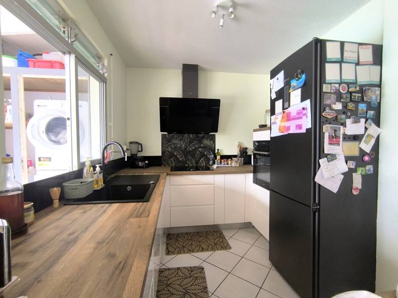 d'une belle cuisine moderne ( plaque de cuisson, hotte, réfigérateur-congélateur four encastré...), donnant sur la terrasse la piscine et le séjour,