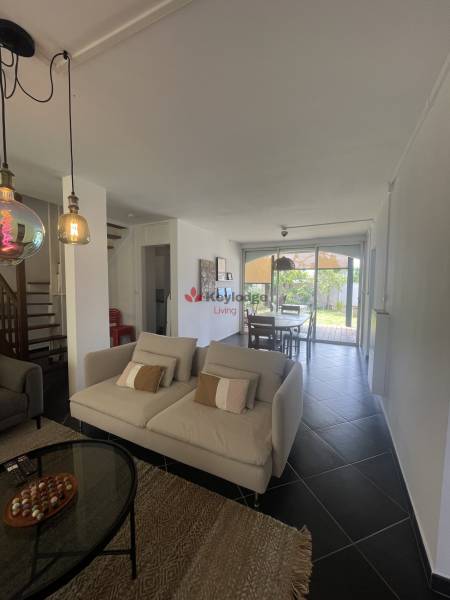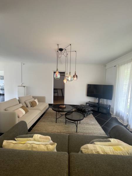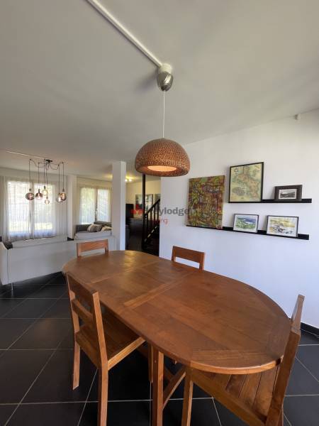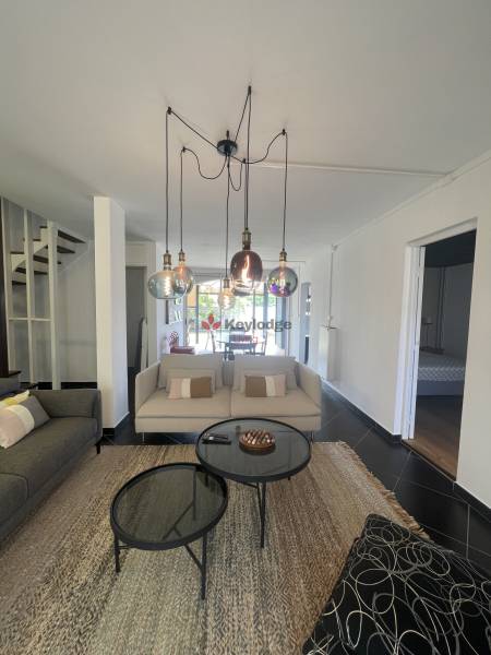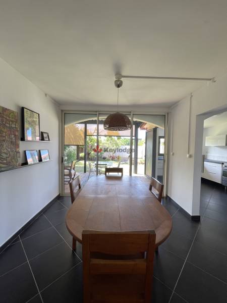 Au rez-de-chaussée, l'entrée de la maison donne sur une cuisine équipée et aménagée avec lave-vaisselle, frigo américain et tous les ustensiles de cuisine nécessaires. Puis un grand séjour salle à manger, un cellier avec machine à laver, ainsi qu'une chambre climatisée de 11 m2.