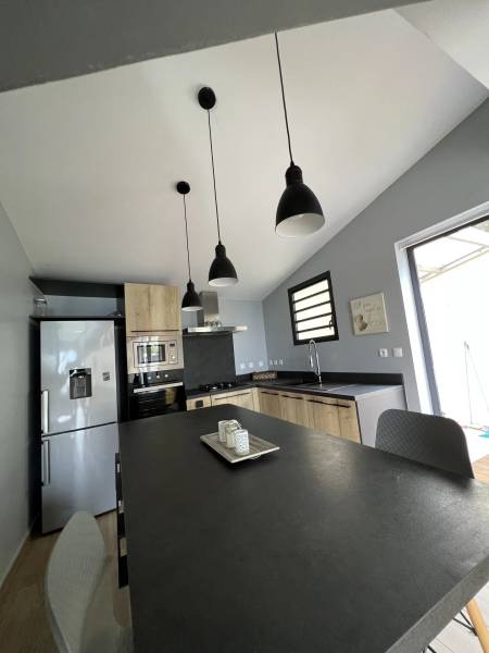 - Une cuisine moderne entièrement équipée ouverte sur un séjour lumineux.