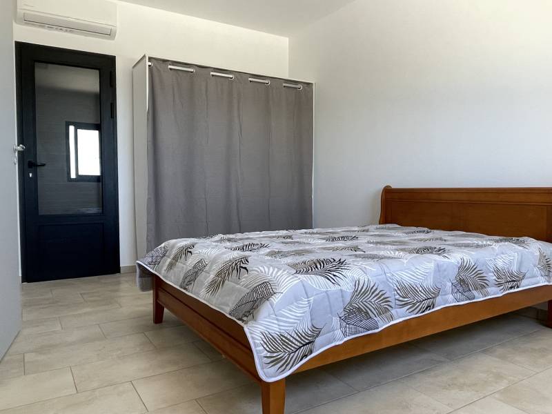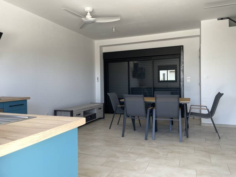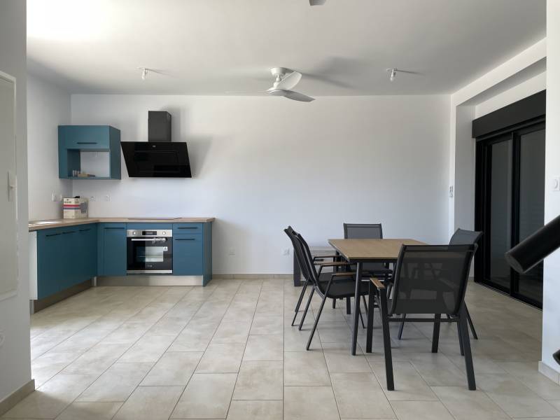 Au rez de chaussée, la maison dispose d'une cuisine ouverte sur un séjour ventillé et une salle d'eau avec wc et une chambre climatisée