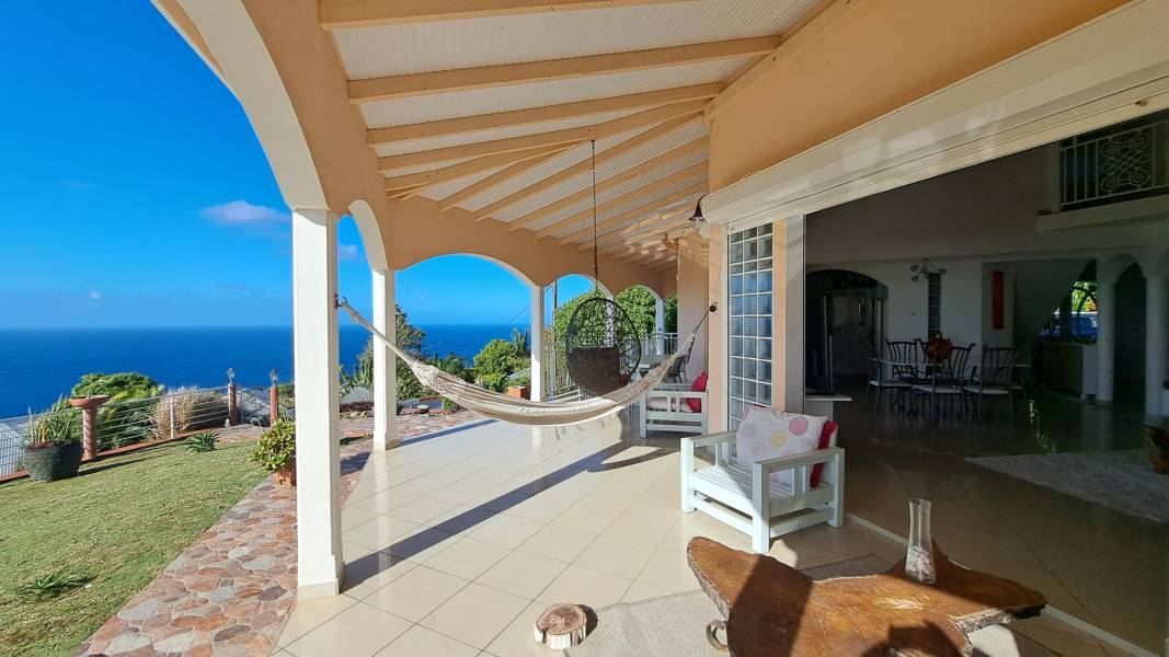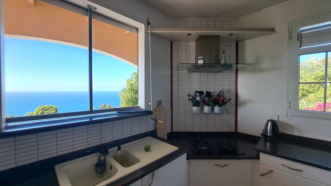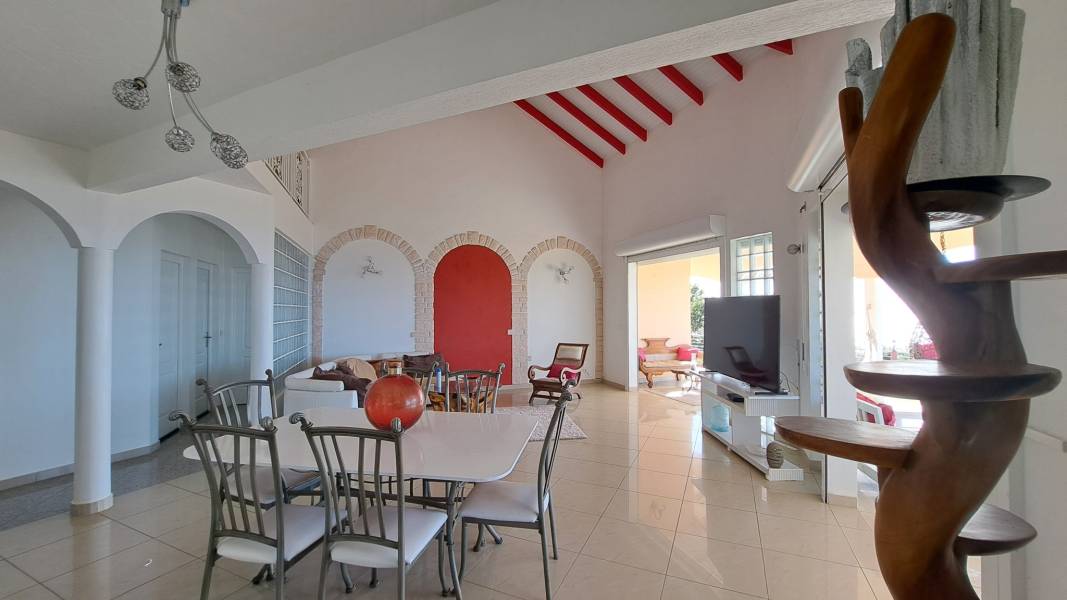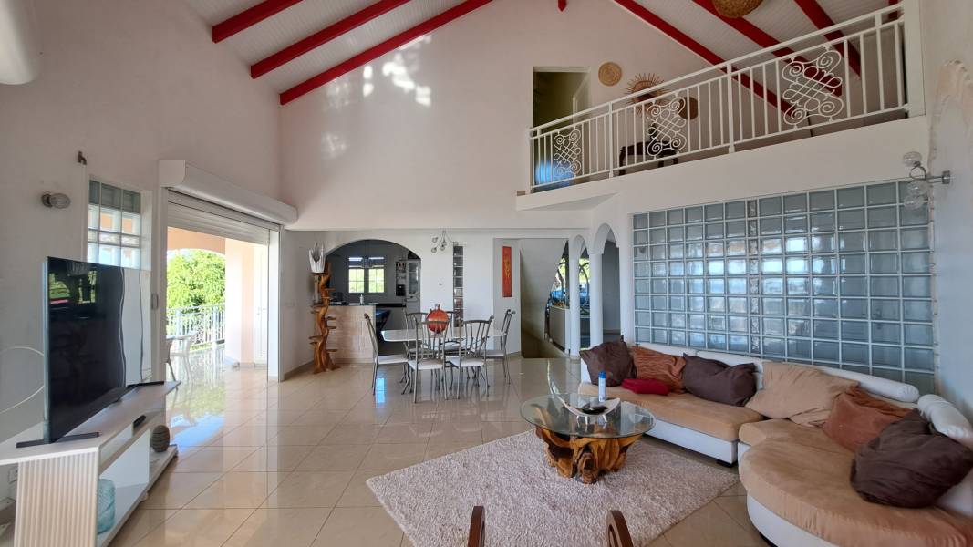 Découvrez cette superbe villa familiale répartie sur trois niveaux, offrant de très beaux volumes, avec un grand jardin entièrement clôturé et une vue mer dégagée sur l'archipel des Saintes. Cette villa comprend :