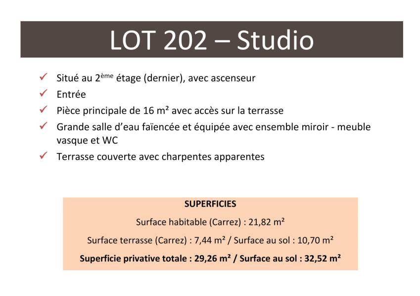 Cet appartement de 21,82 m2 habitable (carrez) auxquels s'ajoute la terrasse couverte de 7,44 m2 (10 m2 surface au sol) vous séduira par son élégance et ses finitions.