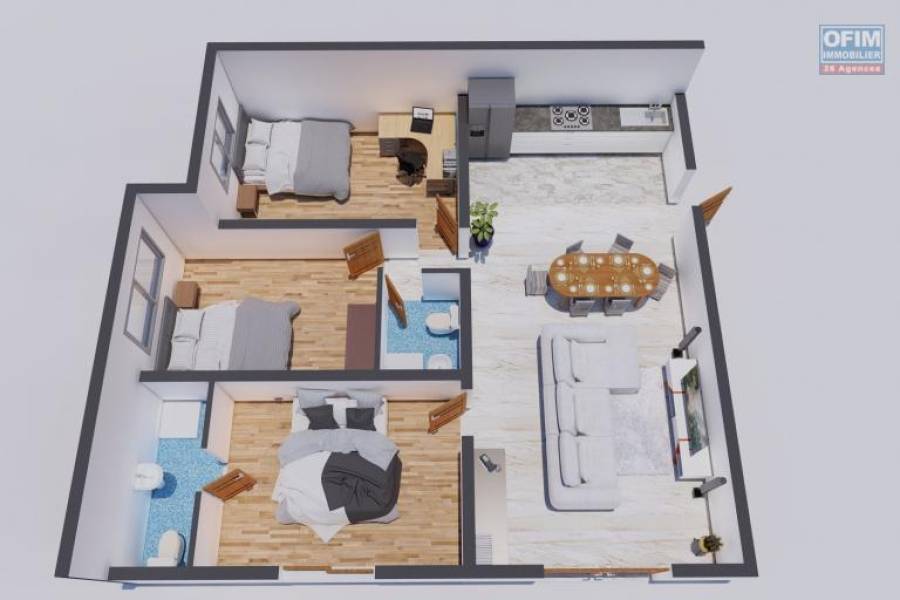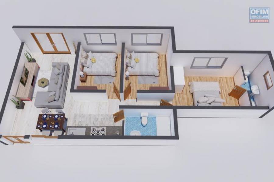 OFIM vous présente une opportunité exceptionnelle : un magnifique appartement de type T4 dans un immeuble de 5 étages actuellement en cours de finition à Ambatobe. L'emplacement est idéal, à seulement 5 minutes à pied du lycée français et de toutes les commodités d'Ambatobe. Avec une vue dégagée en hauteur, cet appartement est également facilement accessible. Il se compose d'un séjour spacieux de 37,41 m2, qui s'ouvre sur un balcon de 3,60 m2 offrant une vue imprenable. La cuisine américaine, intégrée au séjour, crée un espace convivial et moderne. L'appartement comprend une chambre parentale élégante de 13 m2, ainsi que deux autres chambres confortables de 11,07 m2 et 12,56 m2. Une salle d'eau commune de 6,10 m2 et une entrée accueillante de 7,45 m2 . Le prix : 530 000 000 Ariary, d'autant plus que nous vous offrons une facilité de paiement avantageuse jusqu'à la livraison. Pour plus d'informations et pour planifier une visite, nous contacter rapidement au 034 02 218 69. Honoraires à la charge du vendeur 28A68385, Numéro de mandat: 1192T2 Tél. commercial: 0340221869