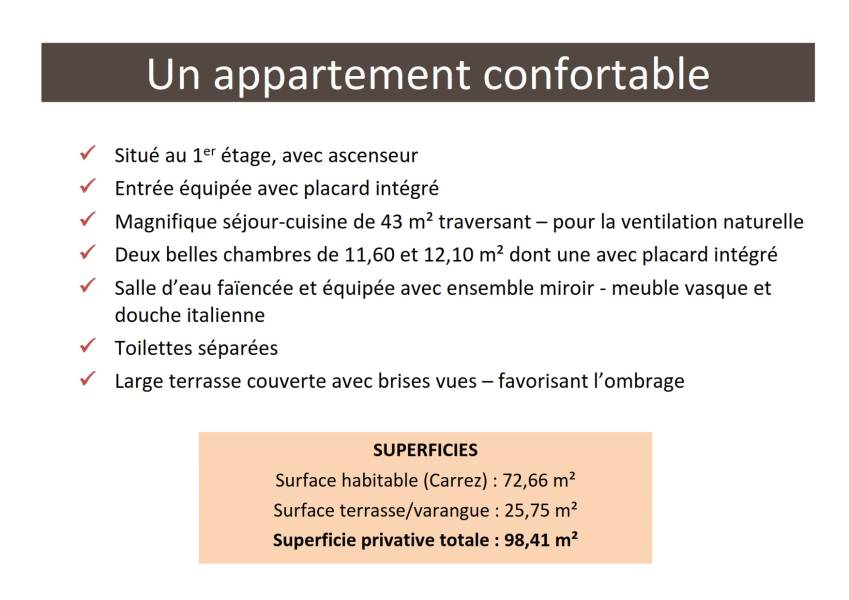 Doté d'un magnifique séjour-cuisine de près de 43 m2, de deux grandes chambres, d'une salle d'eau moderne et d'une superbe terrasse couverte de plus de 25 m2, cet appartement confortable offre un cadre de vie idéal. Profitez également des avantages de l'architecture bioclimatique et de l'emplacement privilégié de la résidence.