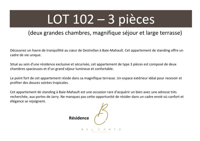 Découvrez les volumes généreux et l'élégance de cet appartement 3 pièces, situé au 1er étage, avec ascenseur, de la résidence de standing privé 'Bel Canto' à Destrellan, Baie-Mahault.