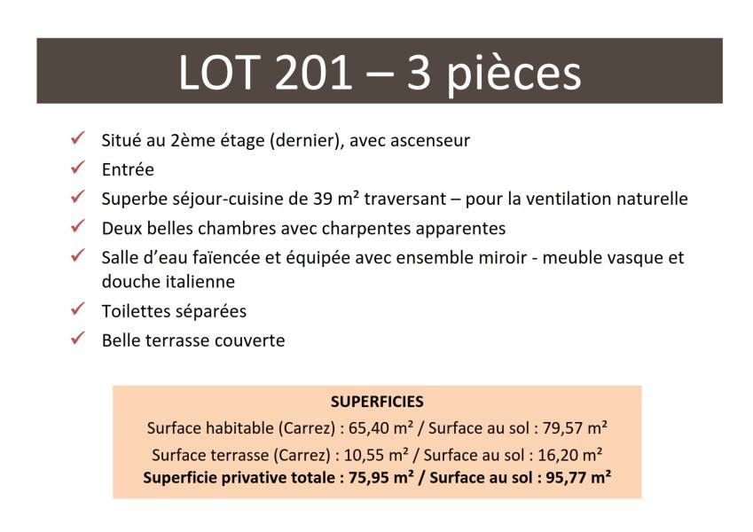Conçu avec charpentes apparentes, cet appartement est doté d'un séjour-cuisine spacieux et traversant de 39 m2 pour le confort et la ventilation, de deux belles chambres, d'une salle d’eau moderne, de toilettes séparées et d'une terrasse couverte de 10,55 m2 (16,20 m2 au sol).