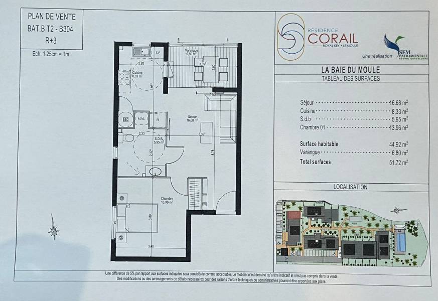 Venez découvrir ce bel appartement 2 pièces de 51.72m2, situé au cœur du quartier Royal Key sur la Presqu’ile de la Baie au Moule, la Résidence Corail à proximité immédiate du tout 1er Hôtel Spa Pullman (groupe Accor) de la Caraïbe.