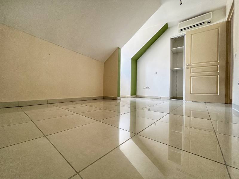 A l'étage : 2 belles chambres climatisées (sous combles), un deuxième WC, une salle de bain et un couloir.