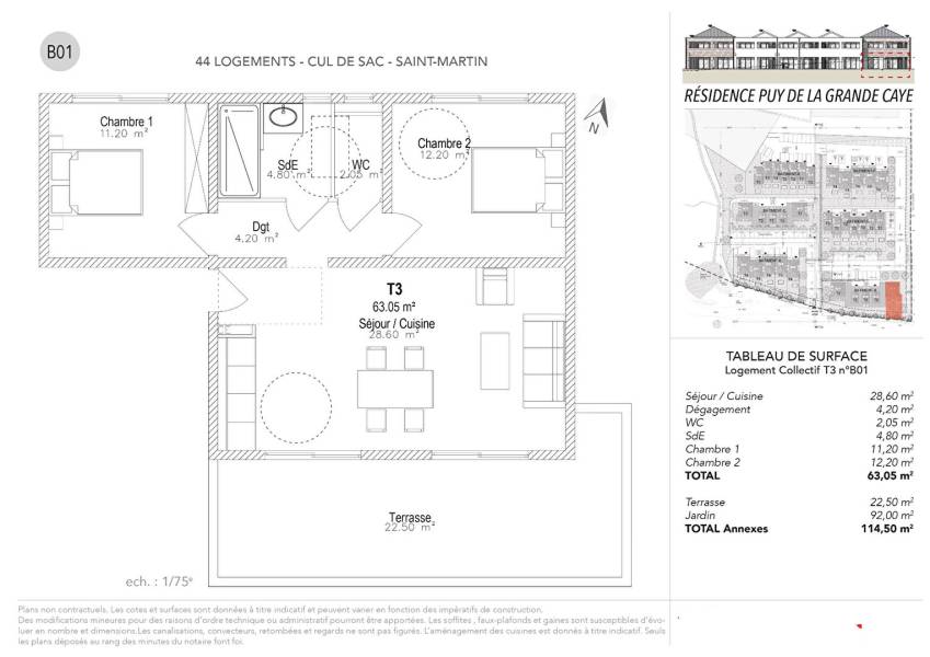 A vendre appartement T3 en VEFA de grand standing d'une superficie de 63m2 avec vue mer sur l'Ilet Pinel et Saint-Barth, terrasse (22,5m2), jardin (92m2) et une place privative dans une résidence privée et sécurisée à Cul de Sac à Saint-Martin. Toutes les pièces sont équipées de climatiseurs et de brasseurs d'air y compris le séjour, la cuisine ouverte sur le séjour est meublée et équipée d'un four, d'une plaque et d'un évier. La salle d'eau offre une grande douche à l'italienne . Avec des finitions de qualités, le sol sera proposé en carrelage 90x22 imitation parquet dans tout le logement. En résidence principale ou secondaire, mais aussi pour des investissements locatifs, cette nouvelle adresse réunit tous les atouts pour en faire un lieu de vie incomparable entre la mer et le sable blanc. La résidence Les Jardins de la Grande Caye, située dans le quartier en expansion de Cul-de-Sac à Saint-Martin, présente une architecture élégante mêlant tradition caribéenne et modernité avec des pierres . Elle se compose de 44 logements répartis entre 20 appartements de 2 à 3 pièces et 24 villas mitoyennes de 3 à 4 pièces, conçus pour un confort optimal et une immersion dans un cadre naturel exceptionnel. Les bâtiments, disposés en plateforme le long de la colline, s'intègrent harmonieusement au paysage grâce à leur utilisation de pierres claires et d'ardoises. Cette appartement bénéficie de jardin privé et de terrasses, offrant des espaces de vie intérieurs et extérieurs confortables et bien pensés. Les Jardins de la Grande Caye bénéficient d'un emplacement privilégié entre Mont Vernon et l'Anse Marcel, offrant un accès facile à la plage de Baie Orientale et à l'animation de Marigot. A proximité de la zone commerciale de Hope Estate et de l'aéroport de Grand-Case, cette résidence est idéale pour ceux qui cherchent à combiner un cadre de vie tranquille avec la commodité d'accéder aux installations sportives, aux plages, et aux commodités urbaines. Les travaux de terrassement ont déja commencé, la livraison du programme est prévue au 4ième trimestre 2026 Réservez dès aujourd'hui votre appartement T3 neuf à Saint-Martin et contactez votre agence Nestenn au [coordonnées réservées] ou le [coordonnées réservées] pour plus de renseignements.